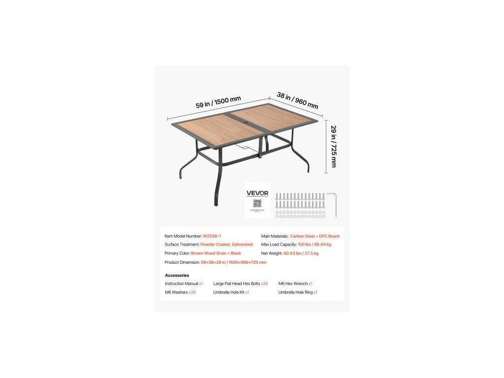 Hlavní materiály: Uhlíková ocel + DPC deska,Rozměry výrobku: 59x38x29 palců / 1505x960x725 mm,Barva: Hnědá dřevitá kresba + černá,Číslo modelu položky: WZ556-1,Povrchová úprava: Práškové lakování, pozinkování,Čistá hmotnost výrobku: 60,63 liber / 27,5 kg,Maximální nosnost: 150 liber / 68,04 kg