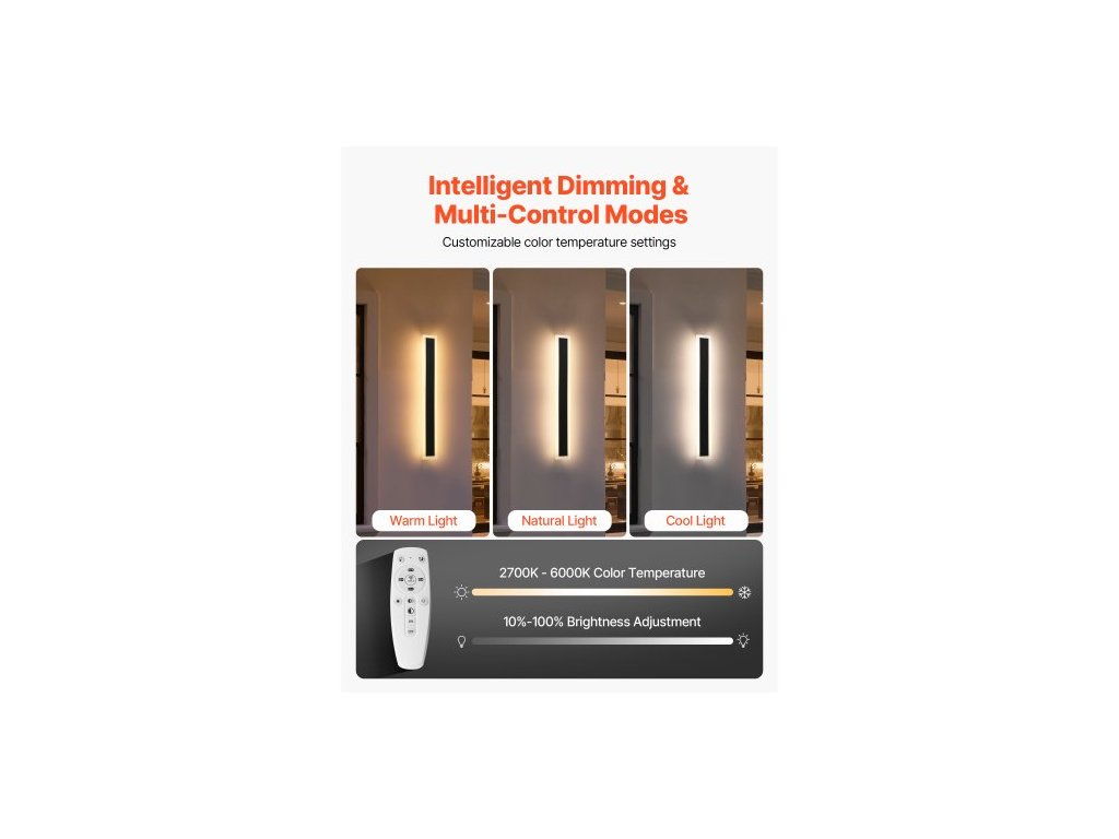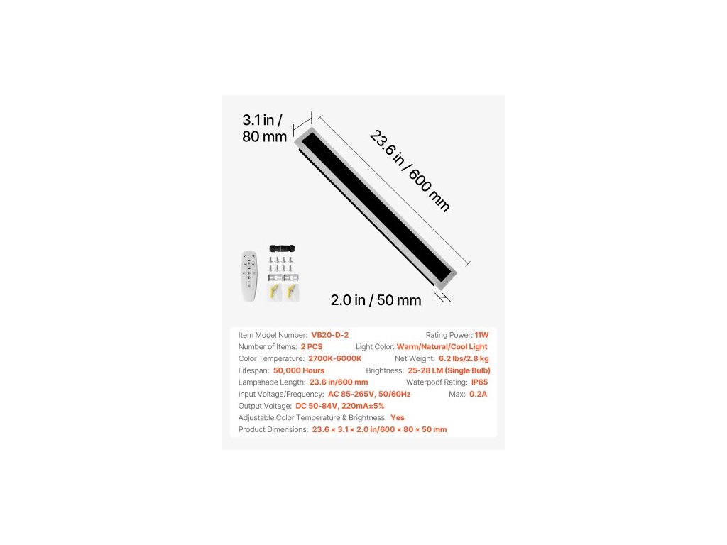 Venkovní nástěnná svítidla , balení 2 ks, 600 mm dlouhý pás, moderní venkovní nástěnná svítidla, 2700K-6000K, IP65, vodotěsné, proti korozi, stmívatelné, venkovní nástěnné osvětlení, pro verandu, garáž a další použití. Všestranné moderní venkovní nástěnné svítidlo. Nastavitelná teplota barev. Vyrobeno pro venkovní odolnost. Montáž s přezkou. Přizpůsobitelné stmívání a ovládání. Více velikostí pro náročné aplikace. Nastavitelná teplota barev a jas: Ano, Barva světla: Teplé/Přirozené/Studené světlo, Jmenovitý výkon: 11 W, Stupeň vodotěsnosti: IP65, Teplota barev: 2700K-6000K, Jas: 25-28 LM (jedna žárovka), Dálkové ovládání součástí balení: Ano, Rozměry výrobku: 600 x 80 x 50 mm, Číslo modelu položky: VB20-D-2, Délka stínidla: 600 mm (20–25 palců), Vstupní napětí/frekvence: AC 85–265 V, 50/60 Hz, Max. 0,2 A, Výstupní napětí: DC 50–84 V, 220 mA ± 5 %, Počet kusů: 2 ks, Životnost: 50 000 hodin, Čistá hmotnost: 2,8 kg
