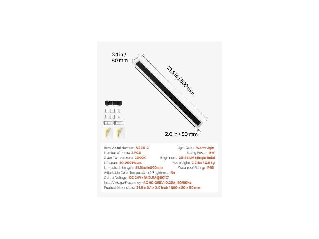 Nastavitelná teplota barev a jas: Ne, Barva světla: Teplé světlo, Jmenovitý výkon: 8 W, Stupeň vodotěsnosti: IP65, Teplota barev: 3000 K, Jas: 25–28 LM (jedna žárovka), Rozměry výrobku: 31,5 x 3,1 x 2,0 palce/800 x 80 x 50 mm, Číslo modelu položky: VB30-2, Délka stínidla: 30–35 palců (31,5 palce/800 mm), Vstupní napětí/frekvence: AC 90–265 V, 0,25 A, 50/60 Hz, Výstupní napětí: DC 24 V = 1 A (0,5 A při 50 °C), Počet kusů: 2 ks, Životnost: 50 000 hodin, Čistá hmotnost: 3,5 kg