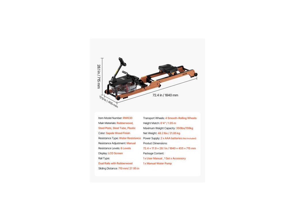 Typ odporu: Vodotěsnost, Výška: 1,95 m, Nastavení odporu: Manuální, Barva: Dřevěná povrchová úprava Sapele, Typ kolejnic: Dvojité kolejnice s kaučukovníkem, Maximální nosnost: 158 kg, Transportní kolečka: 4 hladce se otáčející kolečka, Rozměry produktu: 1840 × 455 × 715 mm, Úrovně odporu: 6 úrovní, Posuvná vzdálenost: 710 mm / 27,95 palce, Hlavní materiály: Kaučukovník, Ocelový plech, Ocelová trubka, Plast, Číslo modelu položky: RW630, Čistá hmotnost: 48,2 lbs / 21,85 kg, Požadované baterie: 2 × baterie AAA (nejsou součástí balení), Displej: LCD obrazovka