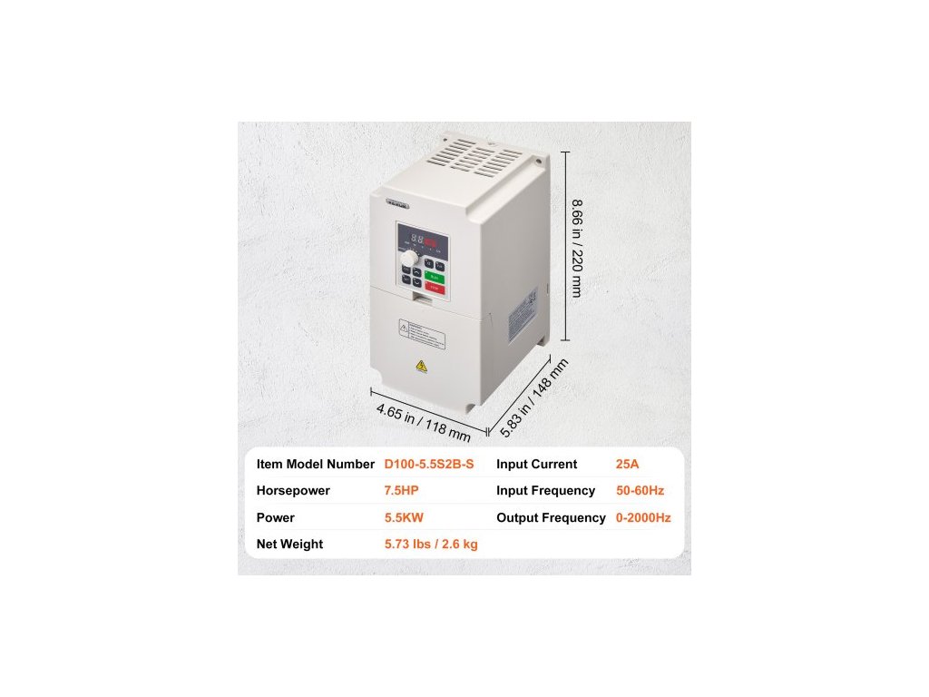 Vstupní frekvence: 50 Hz/60 Hz,Výkon: 7,5 HP,Číslo modelu položky: D100-5,5S2B-S,Vstupní napětí: 1 fázový AC 220 V nebo 3 fázový AC 220 V,Rozměry produktu: 8,66 x 4,65 x 5,83 palce / 220 x 118 x 148 mm, Výstupní napětí: 3PH AC 0~220V, Čistá hmotnost: 5,73 lbs / 2,6 kg, Vstupní proud: 25A, Výkon: 5,5 kW, Výstupní frekvence: 0–2000 Hz