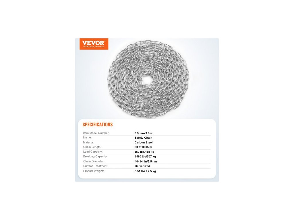 Nosnost: 350 lbs/158 kg,Číslo modelu položky: 3,5 mm x 9,9 m,Povrchová úprava: Pozink,Hmotnost výrobku: 5,51 lbs/2,5 kg,Materiál: Uhlíková ocel,Délka řetězu: 33 ft/10,05 m,Mezní nosnost: 1560 lbs/707 kg,Průměr řetězu: ?0,14 in/3,5 mm