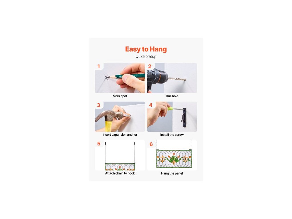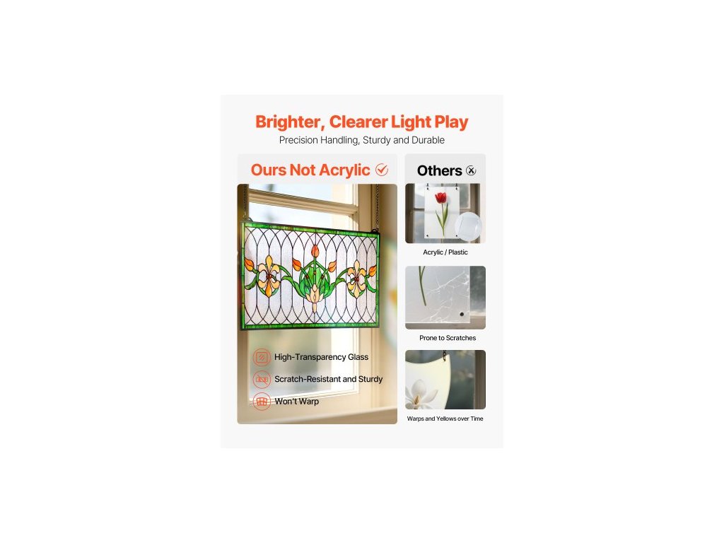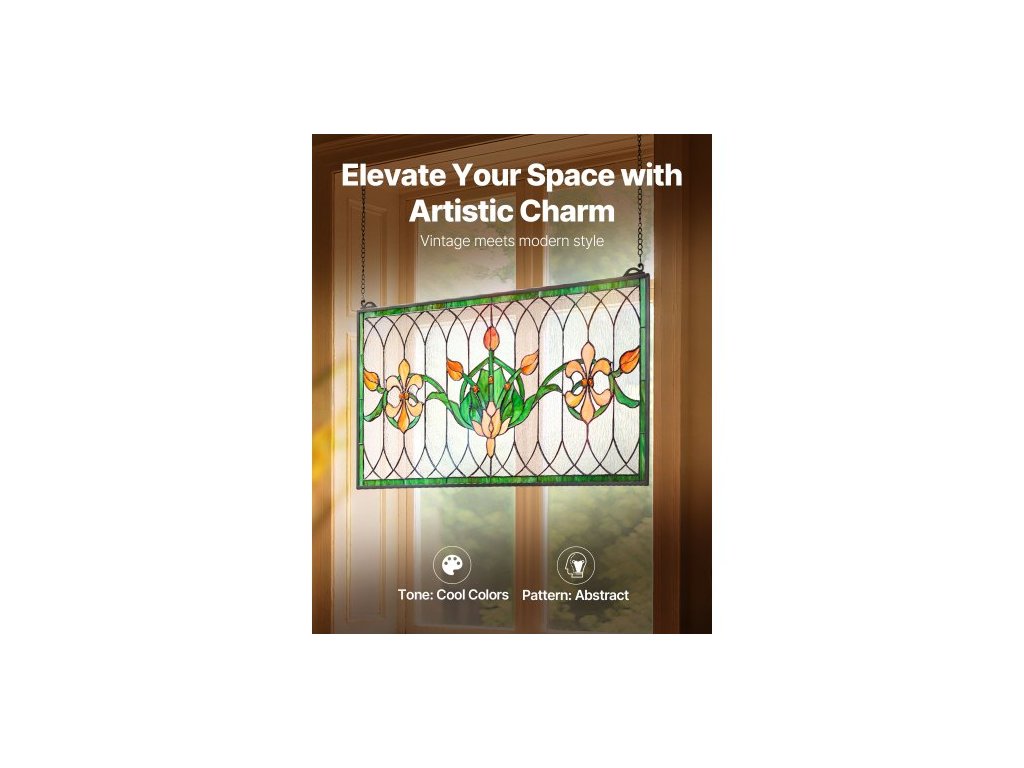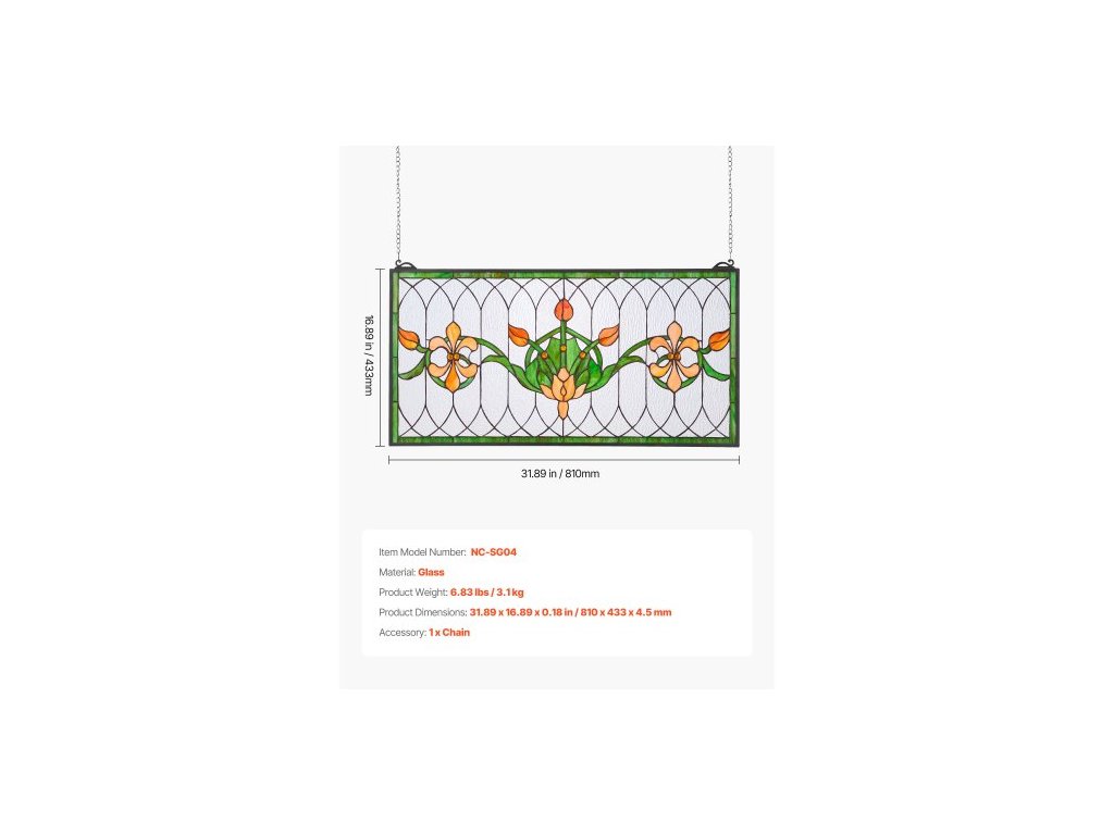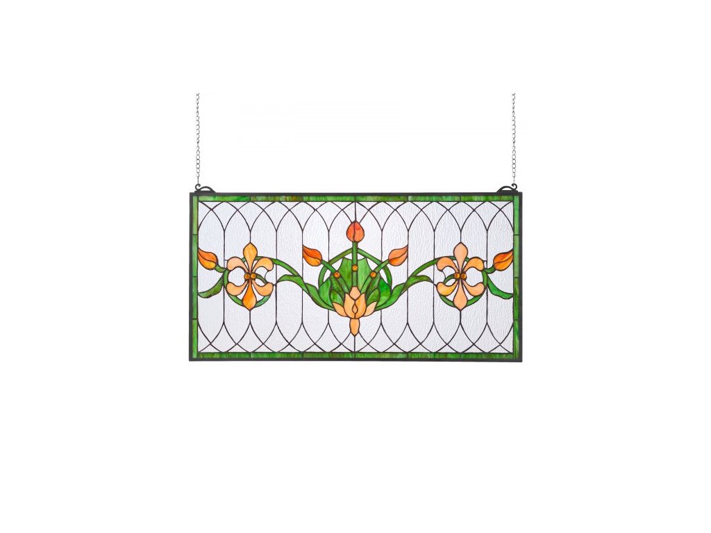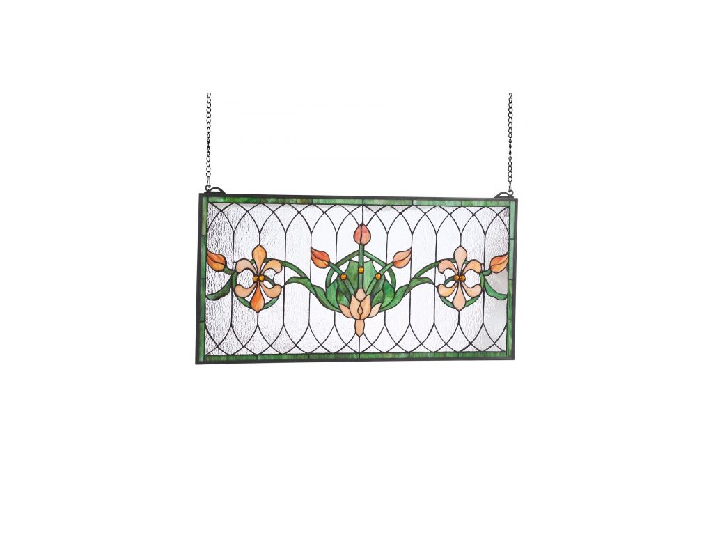 VITÁŽOVÝ OKENNÝ PANELS , 810 x 433 mm, závěsný nadsvětlík ve stylu Tiffany s řetízkem, velký horizontální obdélníkový vitrážový panel, vintage tradiční umělecké řemeslné výrobky pro kuchyňskou a bytovou dekoraci