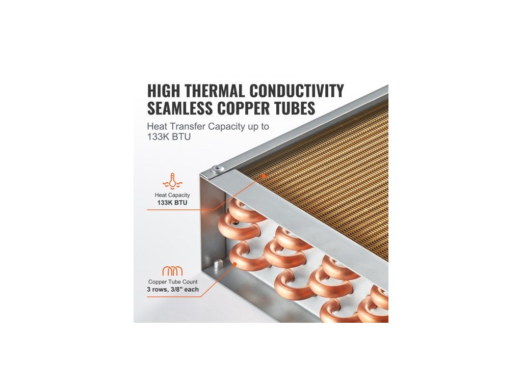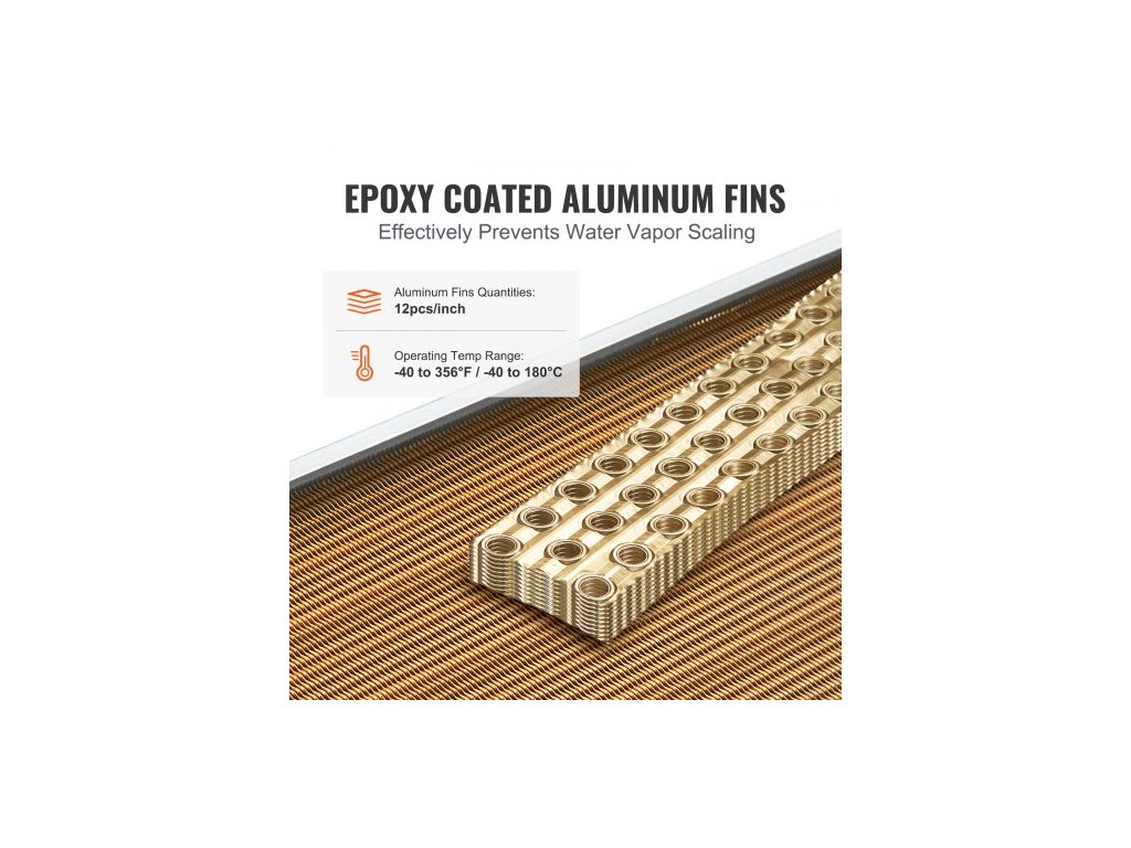 Provozní teplota: -40 °C-180 °C / -40 °F -356 °F,Hlavní materiály: Měď,Maximální provozní tlak: 2,5 MPa,Plocha desky: 18 x 20 palců / 45,72 x 50,8 cm,Tepelná kapacita: ≥133 K BTU,Počet hliníkových žeber: 242 ks,Barva: Zlatá,Model: C18×20,Počet měděných trubek: 3 řady 3/8",Rozměry produktu (D x Š x V): 25,59 x 18,03 x 3,62" / 650 x 458 x 92 mm, Čistá hmotnost (s příslušenstvím): 17,64 lb / 8 kg