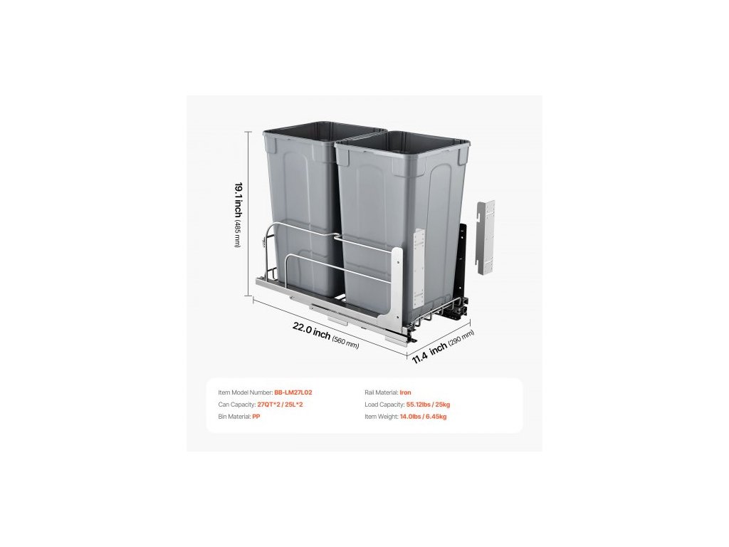 Materiál koše: PP,Nosnost: 66 lbs / 30 kg,Rozměry položky: 22x11x19 palců / 560x290x485 mm,Číslo modelu položky: BB-LM27L02,Materiál kolejnice: Železo,Objem nádoby: 27 qt x 2,Hmotnost položky: 14 lbs / 6,45 kg