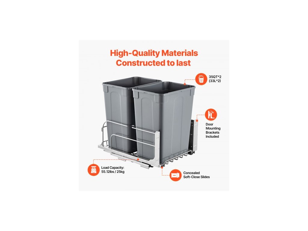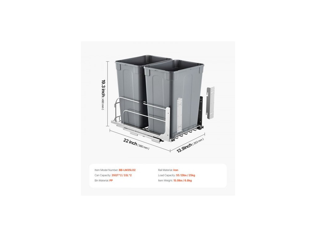 Materiál koše: PP,Nosnost: 66 lbs / 30 kg,Rozměry položky: 13,9x22x19,3 palce / 353x560x490 mm,Číslo modelu položky: BB-LM35L02,Materiál kolejnice: Železo,Objem koše: 35 qt x 2,Hmotnost položky: 15 lbs / 6,8 kg