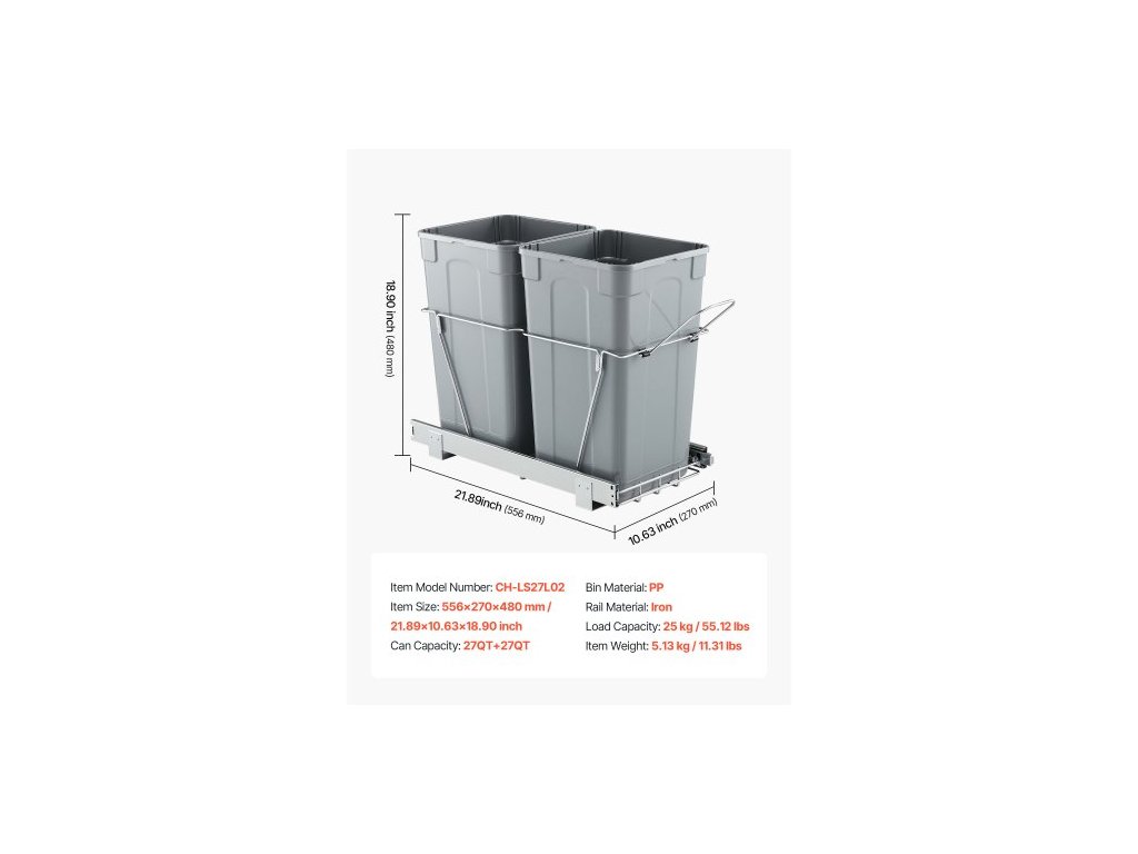 Materiál koše: PP,Nosnost: 25 kg / 55,12 lbs,Číslo modelu položky: CH-LS27L02,Rozměry položky: 556x270x480 mm / 21,89x10,63x18,90 palců:,Materiál kolejnice: Železo,Objem koše: 27QT+27QT,Hmotnost položky: 5,13 kg / 11,31 lbs