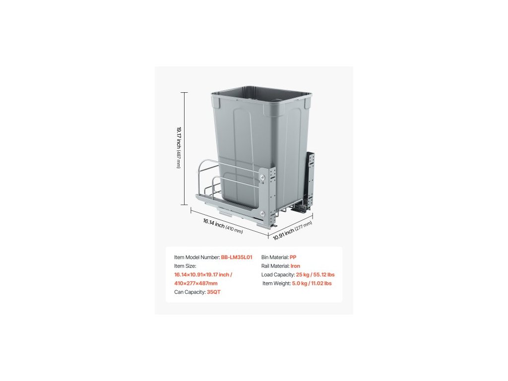 Materiál koše: PP,Rozměry výrobku: 410x277x487mm/16,14x10,91x19,17 palců,Nosnost: 66 lbs / 30 kg,Číslo modelu výrobku: BB-LM35L01,Materiál kolejnice:Železo,Objem koše: 35QT,Hmotnost výrobku: 5,0 kg / 11,02 lbs