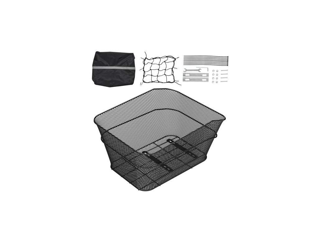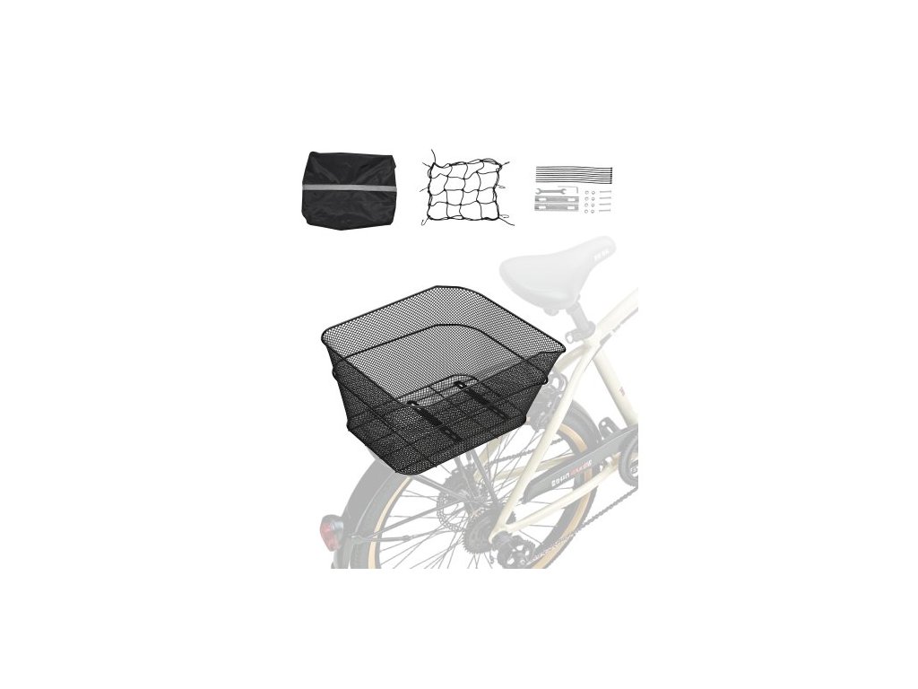 Zadní košík na kolo , drátěný košík na kolo s nákladovou sítí a vodotěsným krytem, odolný kovový košík na kolo, pasuje na většinu zadních nosičů kol, montážní nářadí je součástí balení