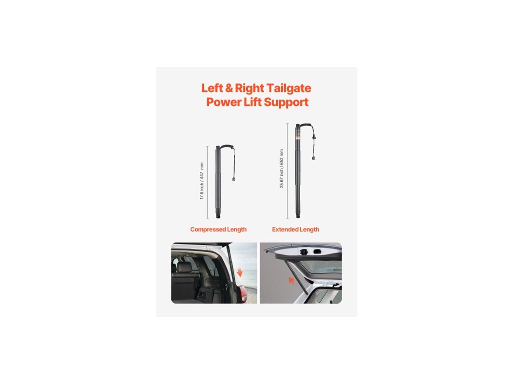 Číslo modelu položky: D5102,Množství: 2,Rozměry produktu: 26,46 x 1,5 x 1,5 palce / 672 x 38 x 38 mm,Čistá hmotnost: 5,42 lbs / 2,46 kg,Umístění na vozidle: Zadní elektricky ovládané vzpěry výklopných dveří (levé/pravé),Jmenovité napětí: DC 12 V