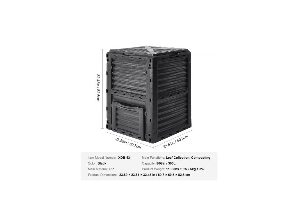 Kapacita: 80 galonů/300 l,Barva: Černá,Číslo modelu položky: XDB-431,Hlavní funkce: Sběr listí, kompostování,Hmotnost výrobku: 11,02 lbs±3%/5 kg ±3%,Rozměry výrobku (DxŠxV): 23,89 x 23,81 x 32,48 palce/60,7 x 60,5 x 82,5 cm,Hlavní materiál: PP