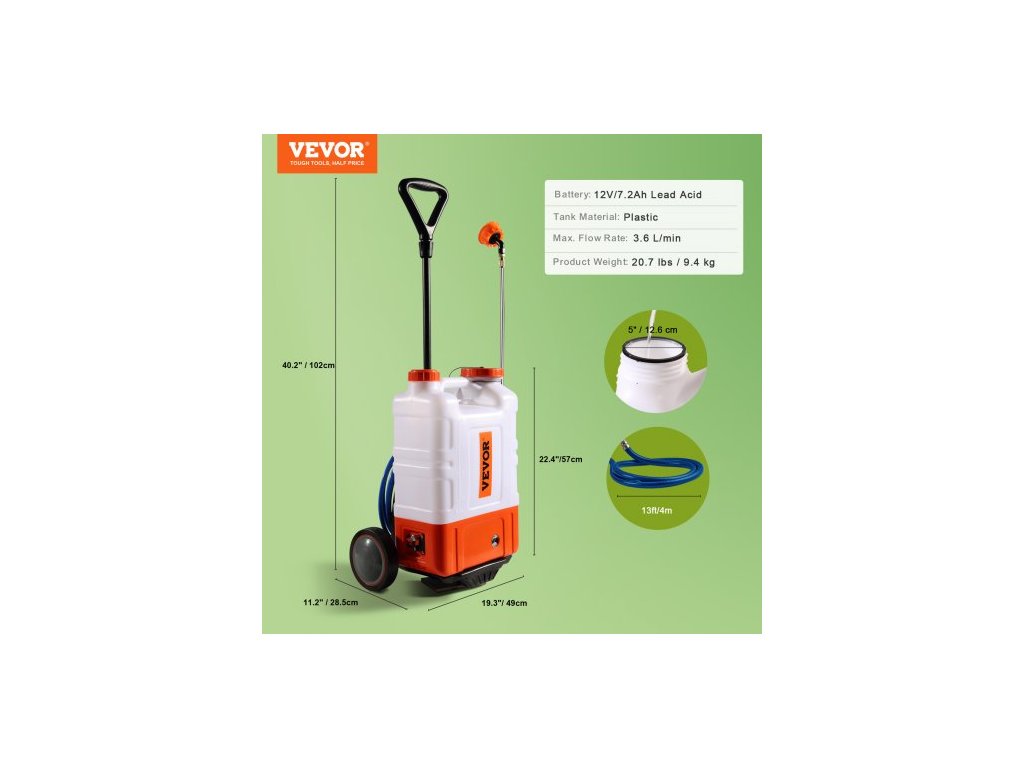 Max. Průtokový výkon: 3,6 l/min, Baterie: 12 V/7,2 Ah Bleisäure, Výkon: 9,4 kg, Výkon: 19,3 x 11,2 x 40,2 Zoll / 49 x 28,5 x 102 cm, KunstTastoffal: Elektrický