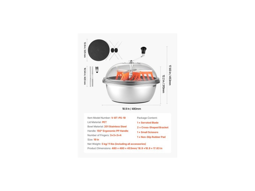 Materiál misky: nerezová ocel 201, čepele: 3 × 3 + 4 × 4, materiál víka: PET, číslo modelu: V-BT-PS-19, rozměry: 480 × 480 × 453 mm, hmotnost: 5 kg, rukojeť: hliníková rukojeť s úhlem 145°