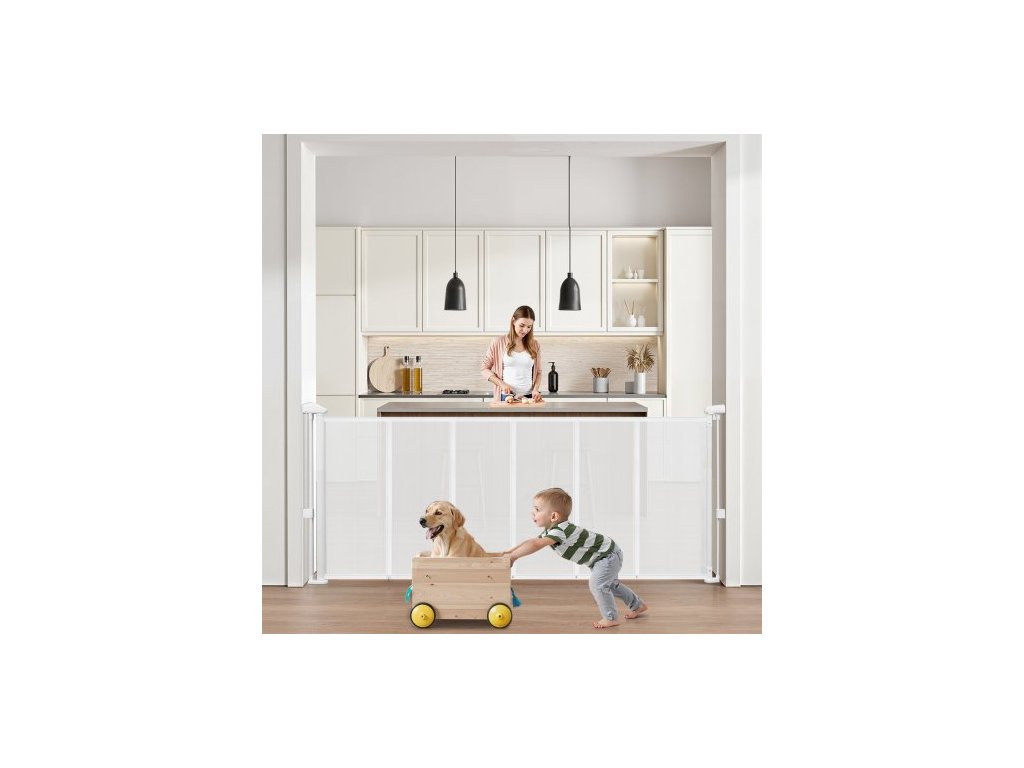 Zatahovací dětská branka, výška 870 mm, roztažitelná až do šířky 1800 mm, Zatahovací branka pro děti nebo domácí mazlíčky, síťovina, snadná instalace pro vnitřní schodiště, dveře, chodby, herny, bílá
