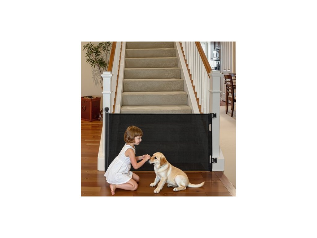 Zatahovací dětská zábrana , roztažitelná na šířku 1430 mm, výšku 795 mm, s bezpečnostním zámkem, snadné použití, průchod bez zakopnutí, síťovaná zábrana pro psy na schody, do chodeb, pro vnitřní i venkovní použití, černá