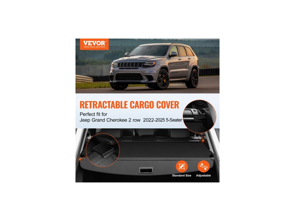Zatahovací kryt zavazadlového prostoru, vylepšený vodotěsný kryt zavazadlového prostoru, bezpečnostní štít pro Jeep Grand Cherokee 2 řady 2022-2025, 5místný, UV odolný kryt zavazadlového prostoru, hliníková slitina a PVC textura kůže