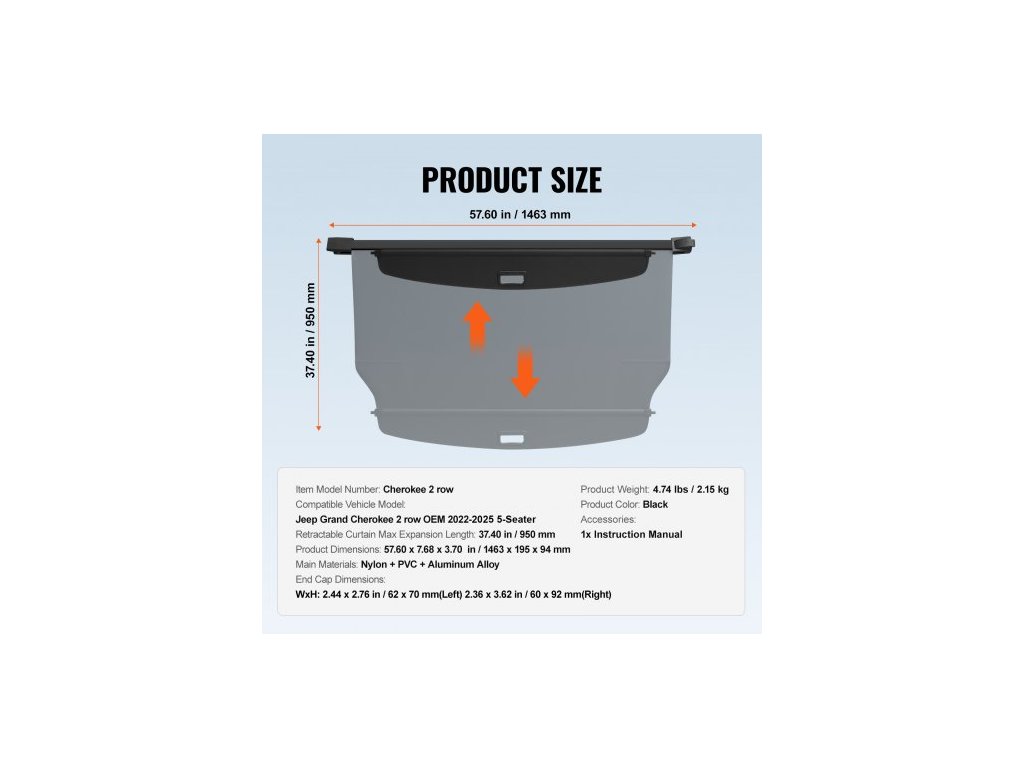 Hlavní materiály: Nylon + PVC + hliníková slitina,Barva produktu: Černá,Zatahovací kryt, maximální délka roztažení: 950 mm,Číslo modelu: Cherokee 2 řady,Hmotnost produktu: 2,15 kg,Rozměry koncovky: ŠxV: 62 x 70 mm (vlevo) 60 x 92 mm (vpravo),Rozměry produktu: 57,60 x 7,68 x 3,70 palce/1463 x 195 x 94 mm, Kompatibilní model vozidla: Jeep Grand Cherokee 2 řady OEM 2022-2025 5místný